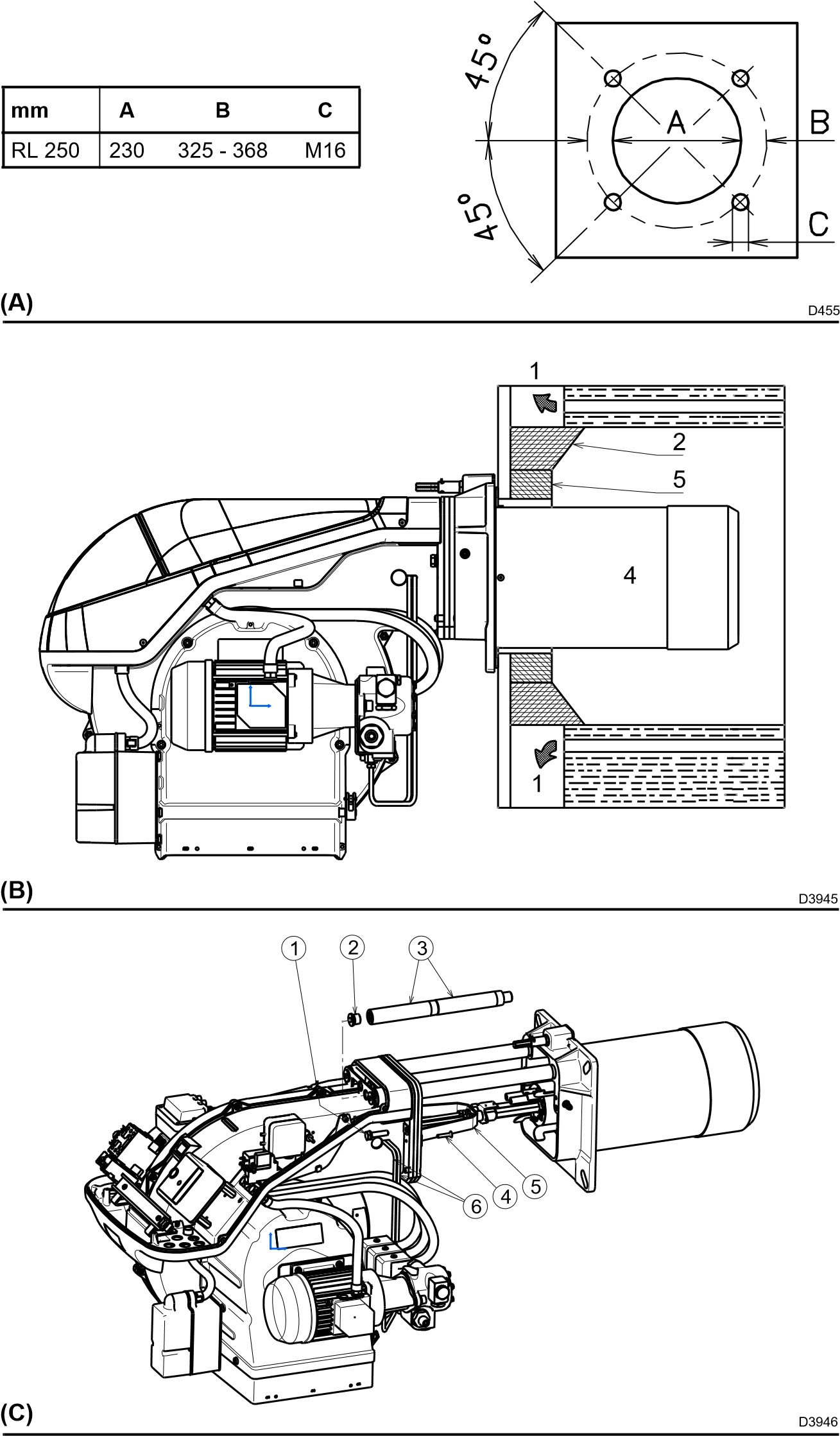 • letakkan seluruh pembakar pada lubang boiler (yang telah diatur sebelumnya, lihat gbr. (A), dan kencangkan dengan sekrup yang diberikan sebagai peralatan standar. Kopling pembakar-boiler harus kedap udara.