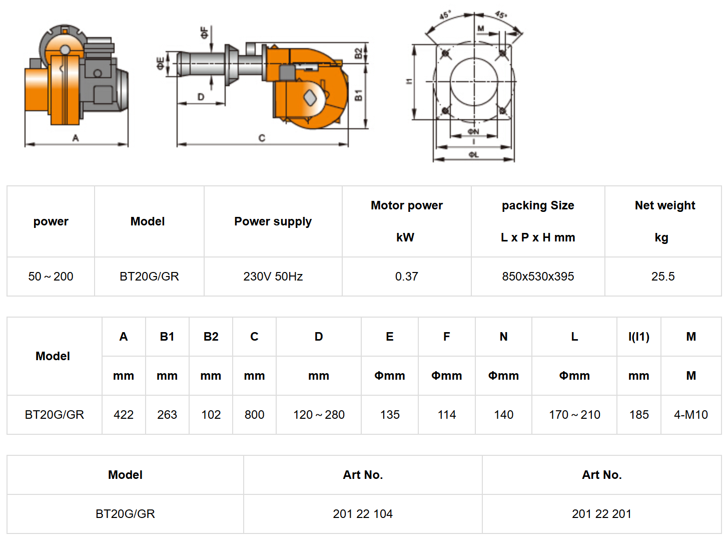 Burner Baite BT 20G/GR adalah Burner Gas dengan sistem kerja satu stage/satu tahap pembakaran dengan mengguanakan 1 Selenoid Gas. dan ada dua Stage /dua tahap pembakaran dengan 2 Solenoid. Type ini memiliki kelebihan dengan heat Kit / corong api yang lebih panjang untuk mempermudah pemasangan pada tungku pembakaran.
