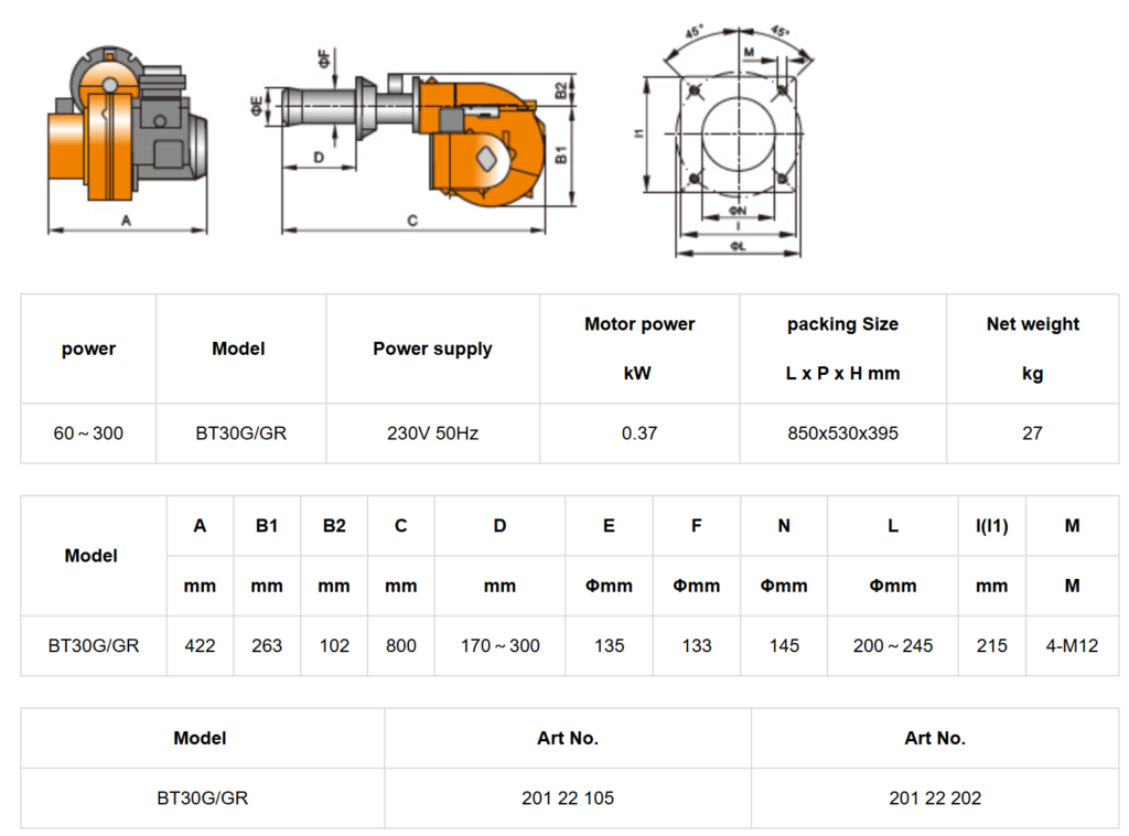 Burner Baite BT 30G/GR adalah Burner Gas dengan sistem kerja satu stage/satu tahap pembakaran dengan mengguanakan 1 Selenoid Gas. dan ada dua Stage /dua tahap pembakaran dengan 2 Solenoid. Type ini memiliki kelebihan dengan heat Kit / corong api yang lebih panjang untuk mempermudah pemasangan pada tungku pembakaran.