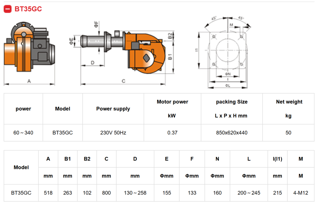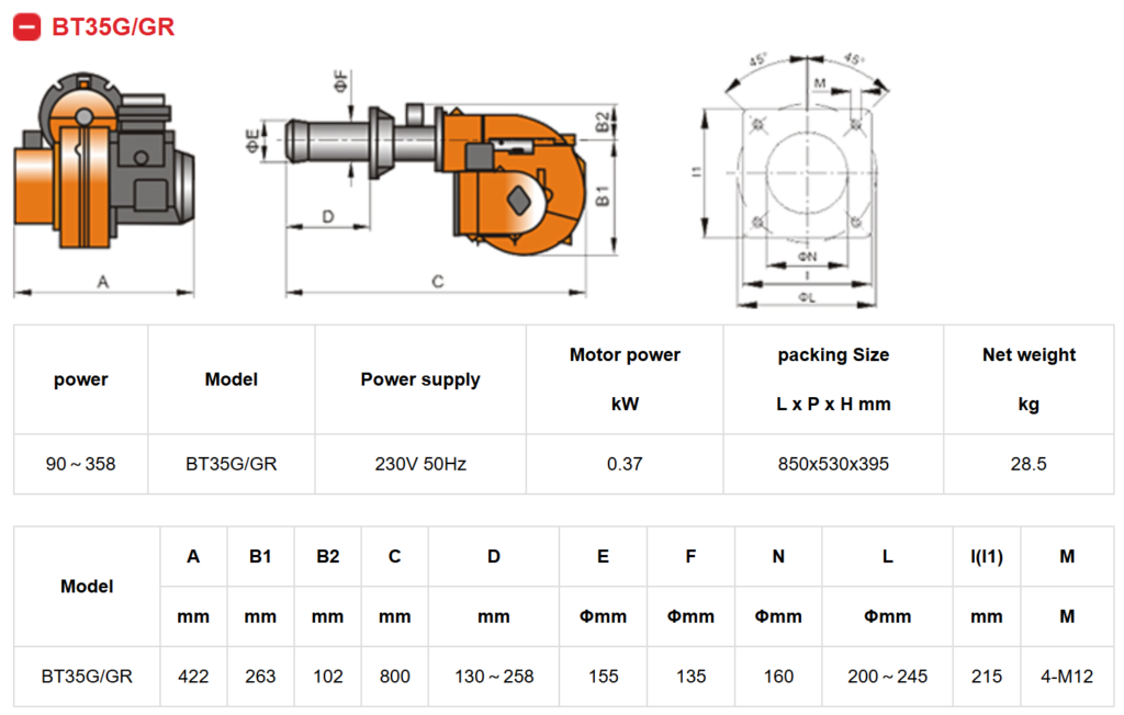 Burner Baite BT 35 G/GR adalah Burner Gas dengan sistem kerja satu stage/satu tahap dan Modulasi pembakaran dengan mengguanakan 1 Selenoid Gas, dua Stage /dua tahap pembakaran dengan 2 Solenoid dan dengan sistem modulasi dengan menggunakan Slising Servo. Type ini memiliki kelebihan dengan heat Kit / corong api yang lebih panjang untuk mempermudah pemasangan pada tungku pembakaran.