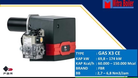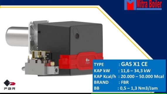 Gas Burner FBR Gas X5 CE adalah Fabrikas asal negara ITALIA Burner yang memiliki kapasitas 151 hingga 349 kW dengan Pembakar gas satu tahap dengan bodi aluminium die-cast, kipas bertekanan tinggi, kepala pembakaran dengan penyetelan pada efisiensi tinggi dan stabilitas nyala api tinggi serta penutup pelindung dengan pelat peredam bising. Dimensi keseluruhan yang ringkas dan penempatan komponen yang rasional dengan aksesibilitas yang difasilitasi untuk pengoperasian pengaturan dan pemeliharaan.