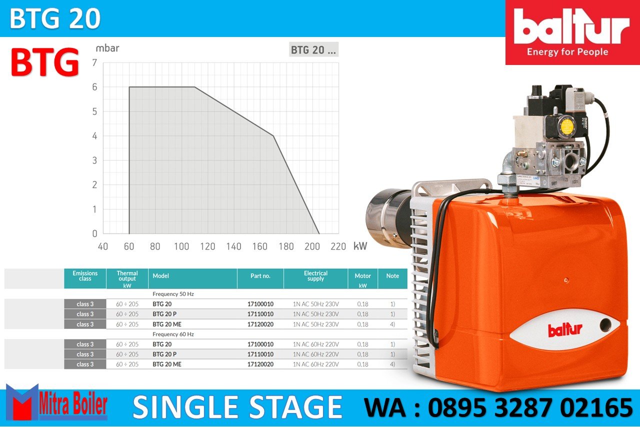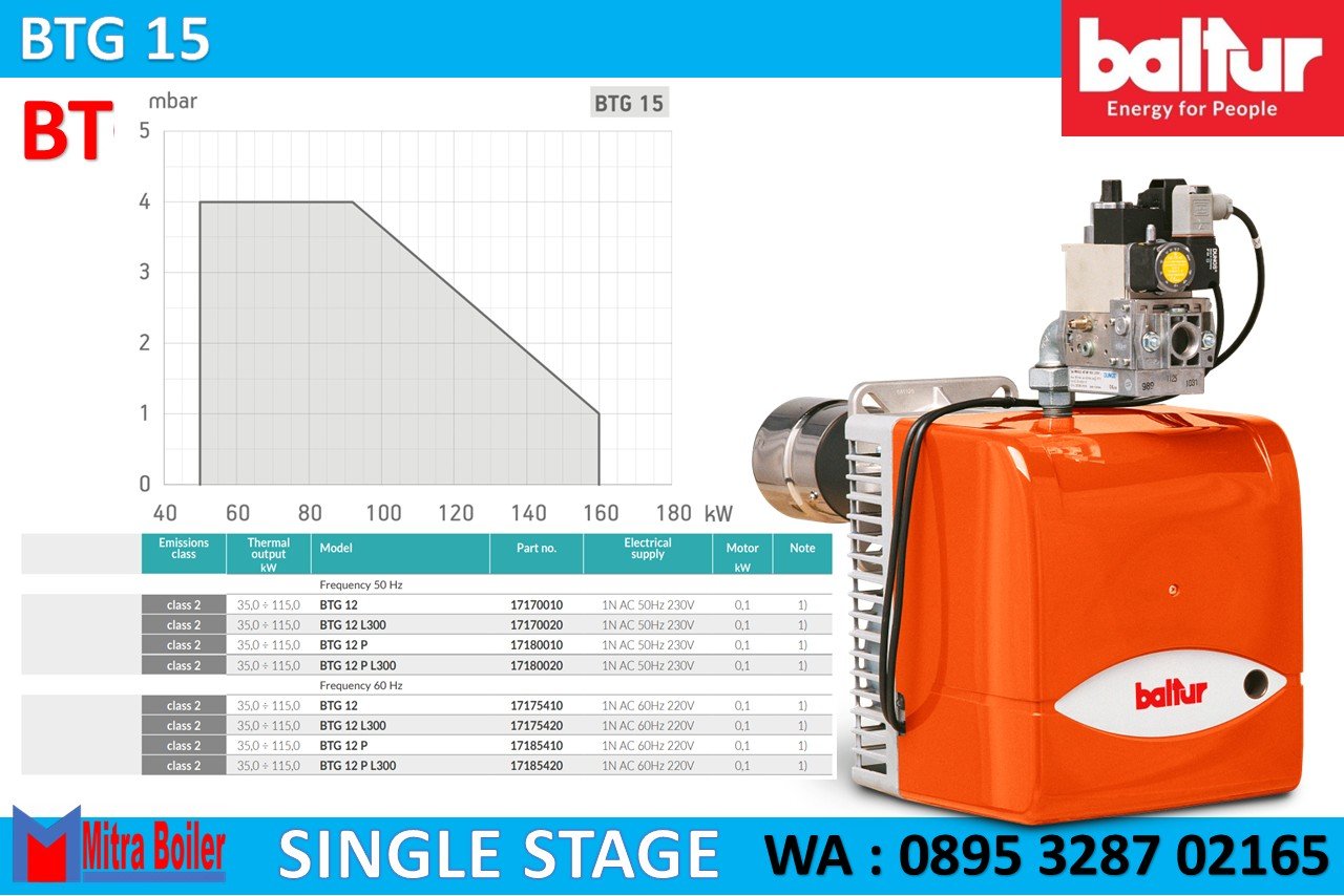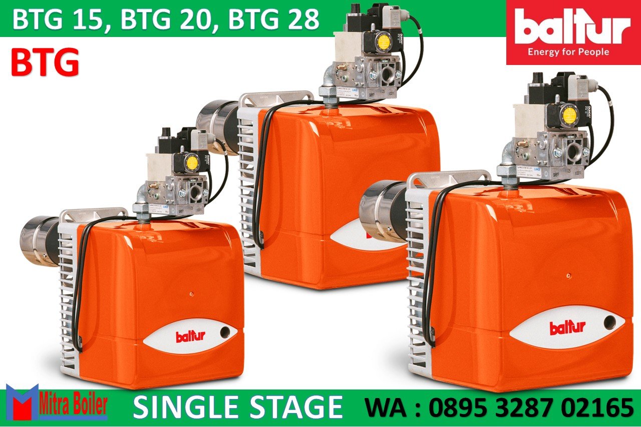 Gas Burner Baltur seri BTG adalah burner Itali dengan pengoperasian satu tahap ialah Pembakar gas yang sesuai dengan standar Eropa EN676, Pengaturan udara pembakaran dan kepala pembakaran. Asupan udara pembakaran dengan peredam gas. Penyesuaian laju aliran udara secara manual. Peredam udara menutup secara jeda untuk mencegah penyebaran panas ke cerobong asap. Perawatan mudah karena unit pencampur dapat dilepas tanpa harus membongkar pembakar dari ketel. Flensa kopling generator tetap.