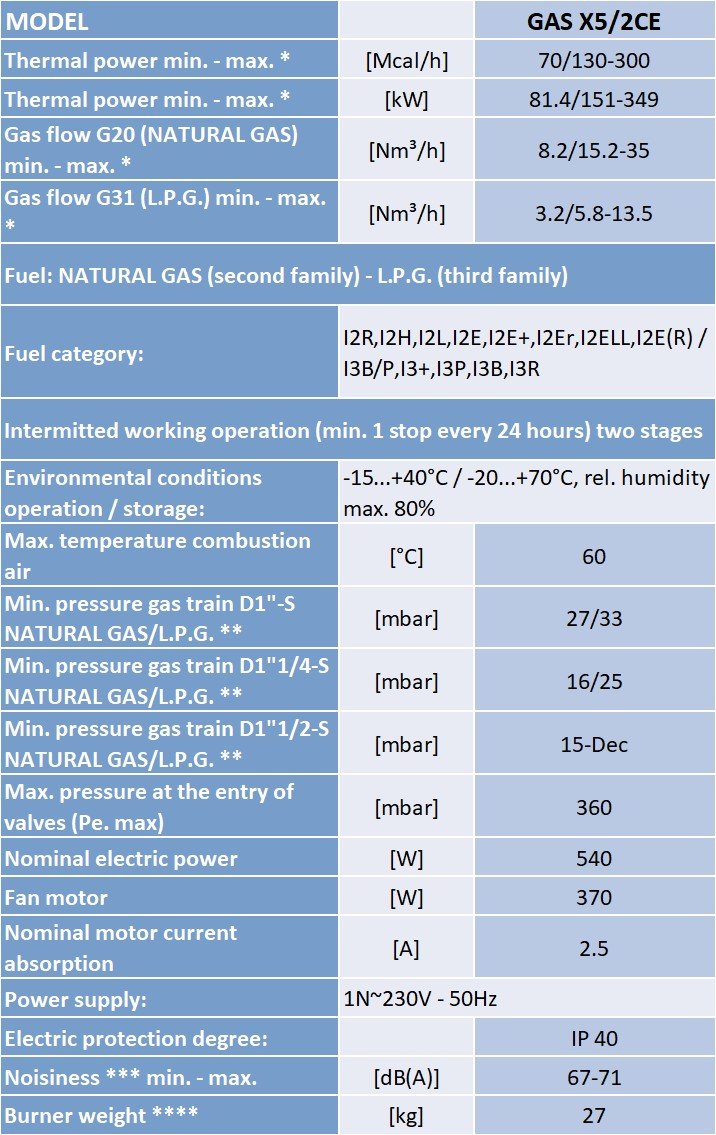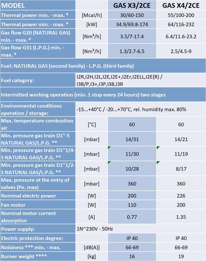 Burner GAS X3/2CE Pembakar gas dua tahap dengan kapasitas 30.000 – 150.000 Kcal/jam, SERTA Burner GAS X4/2CE Pembakar gas dua tahap dengan kapasitas 55.000 – 200.000 Kcal/jam, dengan: badan aluminium, kipas bertekanan tinggi dan kepala pembakaran dengan penyetelan pada efisiensi tinggi dan stabilitas nyala api tinggi serta penutup pelindung dengan pelat peredam bising. Dimensi keseluruhan yang ringkas dan penempatan komponen yang rasional dengan aksesibilitas yang difasilitasi untuk pengoperasian pengaturan dan pemeliharaan.
