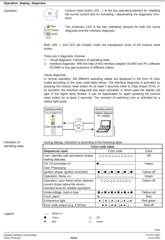 - Tekan tombol reset lockout pada kontrol burner atau ekstensi tombol reset AGK20.43 hanya secara manual (menerapkan gaya tidak lebih dari 10 N), tanpa menggunakan alat atau benda runcing apa pun