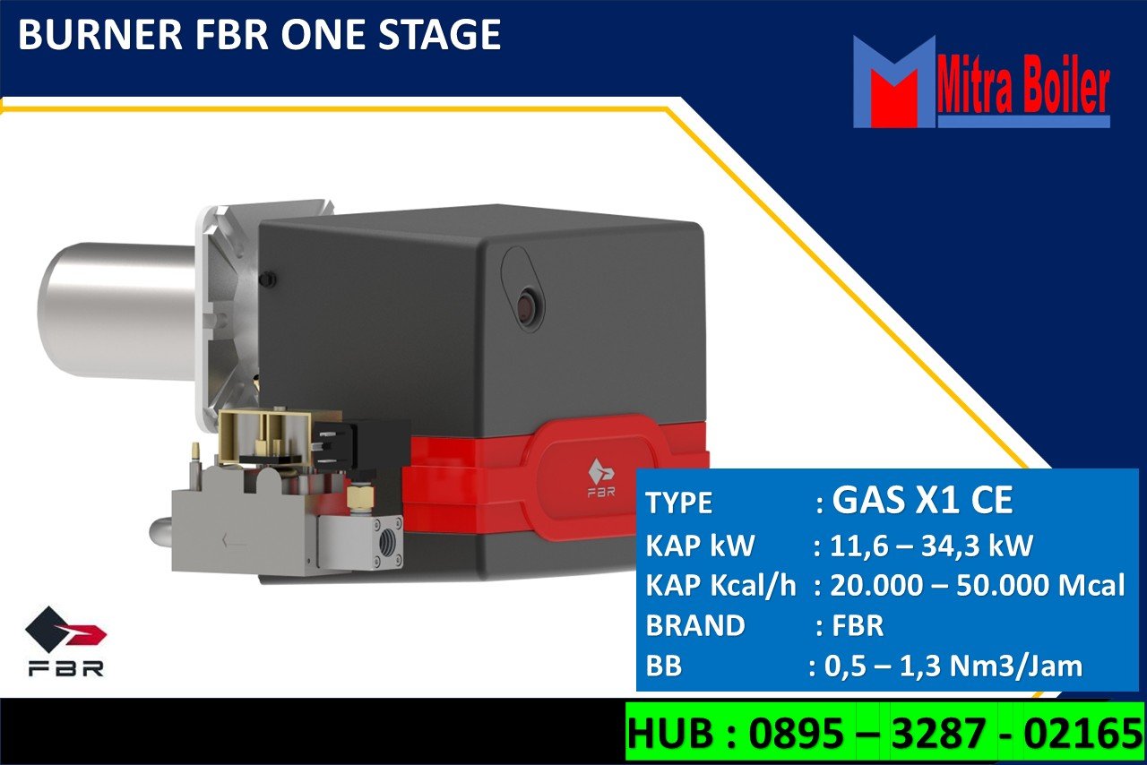 Burner FBR Gas X1 CE adalah burner Italia dengan rentang pembakaran 23.2 – 58.1 kW, Pembakar gas satu tahap dengan: bodi aluminium die-cast, kipas bertekanan tinggi, kepala pembakaran dengan penyetelan pada efisiensi tinggi dan stabilitas nyala api tinggi serta penutup pelindung dengan pelat peredam bising. Dimensi keseluruhan yang ringkas dan penempatan komponen yang rasional dengan aksesibilitas yang difasilitasi untuk pengoperasian pengaturan dan pemeliharaan.