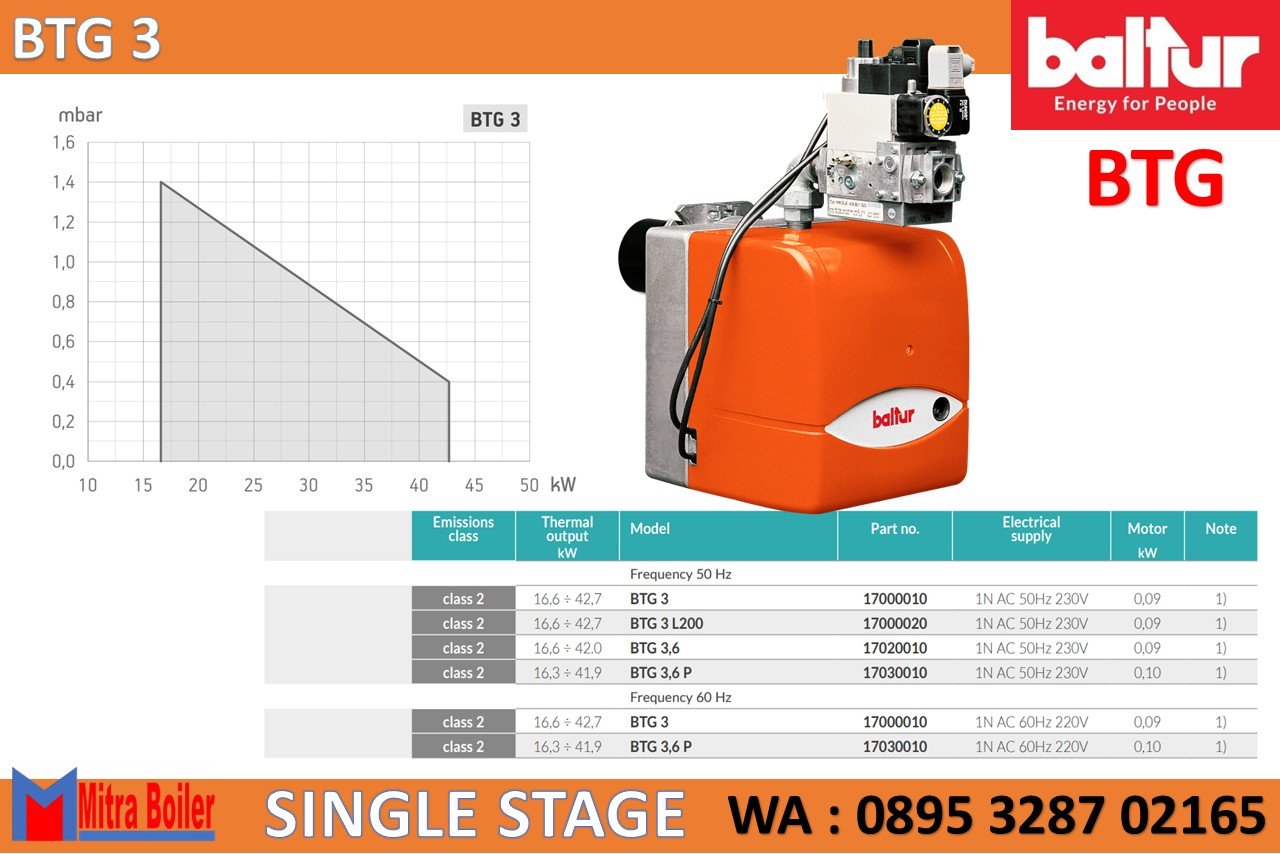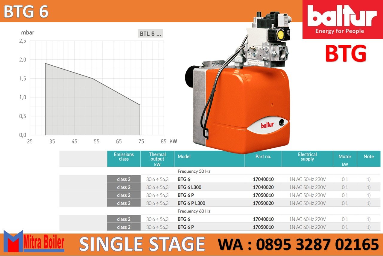 Gas Burner Baltur seri BTG adalah burner Itali dengan pengoperasian satu tahap ialah Pembakar gas yang sesuai dengan standar Eropa EN676, Pengaturan udara pembakaran dan kepala pembakaran. Asupan udara pembakaran dengan peredam gas. Penyesuaian laju aliran udara secara manual. Peredam udara menutup secara jeda untuk mencegah penyebaran panas ke cerobong asap. Perawatan mudah karena unit pencampur dapat dilepas tanpa harus membongkar pembakar dari ketel. Flensa kopling generator tetap.