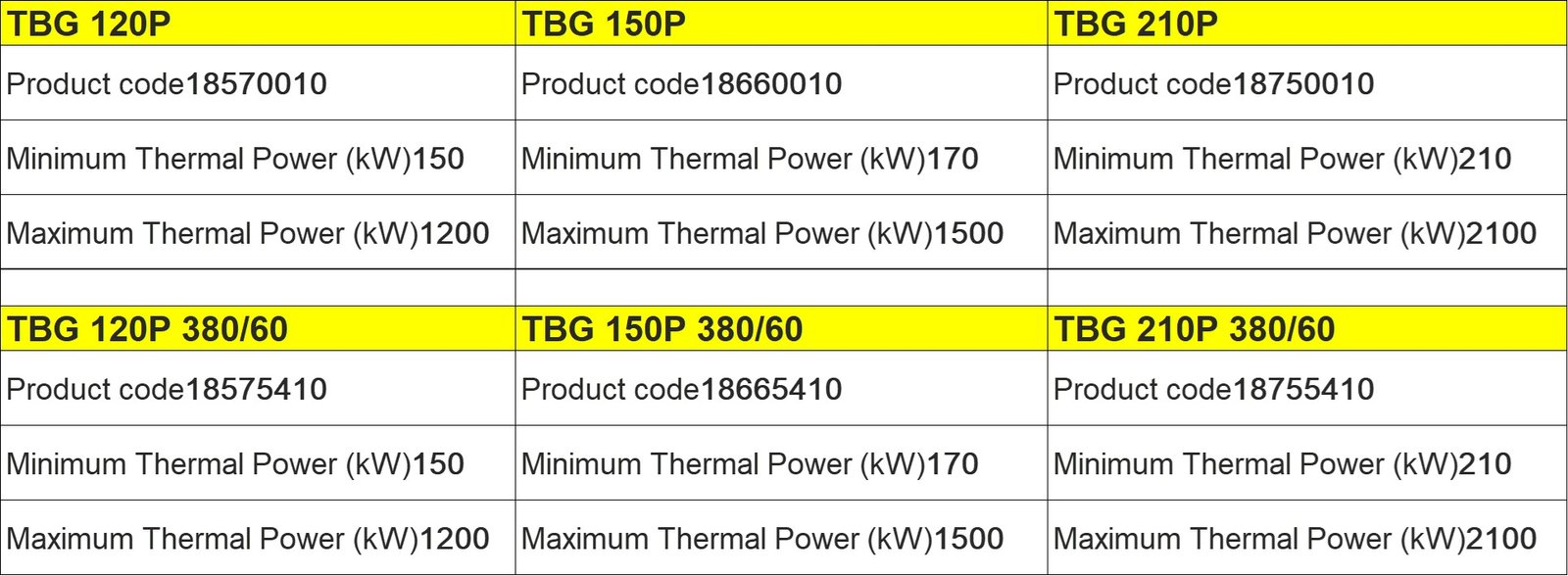 Burner Gas Baltur TBG adalah burner Two Stage/ Dua tahap daya dengan Kelas emisi 3 menurut EN676 Blok tunggal, Fitur utama Pembakar gas yang dihomologasi EC menurut EN676. Operasi dua tahap, Pembakar dengan emisi NOx dan CO rendah sesuai dengan EN676: kelas 3, Pengaturan udara pembakaran dan kepala pembakaran, Penyesuaian aliran udara dengan servomotor elektrik, Flensa sambungan generator geser untuk menyesuaikan tonjolan kepala dengan berbagai jenis generator panas, Kemungkinan untuk mengintegrasikan pembakar dengan perangkat untuk kontrol segel katup, Deteksi api dengan menggunakan elektroda ionisasi, Sistem kelistrikan IP44.