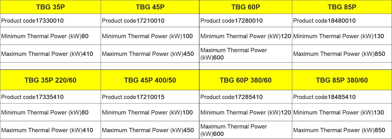 Burner Gas Baltur TBG adalah burner Two Stage/ Dua tahap daya dengan Kelas emisi 3 menurut EN676 Blok tunggal, Fitur utama Pembakar gas yang dihomologasi EC menurut EN676. Operasi dua tahap, Pembakar dengan emisi NOx dan CO rendah sesuai dengan EN676: kelas 3, Pengaturan udara pembakaran dan kepala pembakaran, Penyesuaian aliran udara dengan servomotor elektrik, Flensa sambungan generator geser untuk menyesuaikan tonjolan kepala dengan berbagai jenis generator panas, Kemungkinan untuk mengintegrasikan pembakar dengan perangkat untuk kontrol segel katup, Deteksi api dengan menggunakan elektroda ionisasi, Sistem kelistrikan IP44.