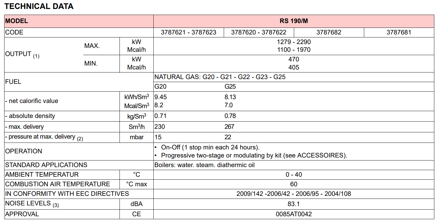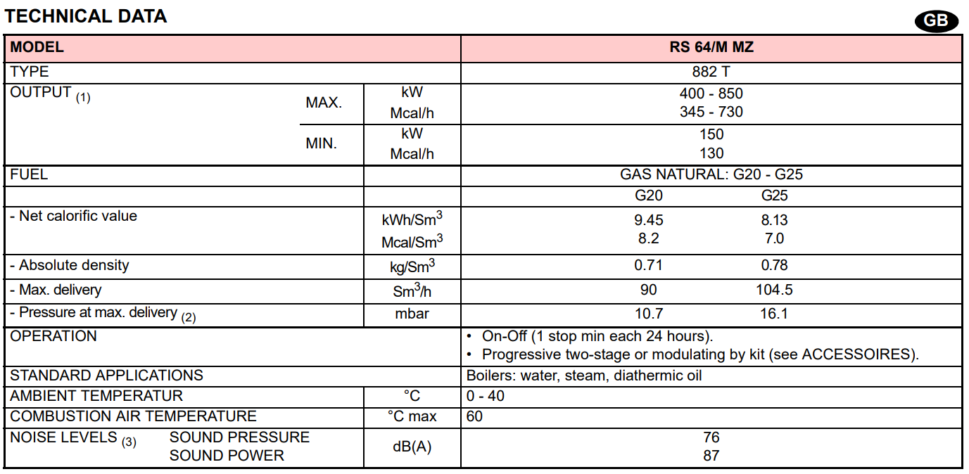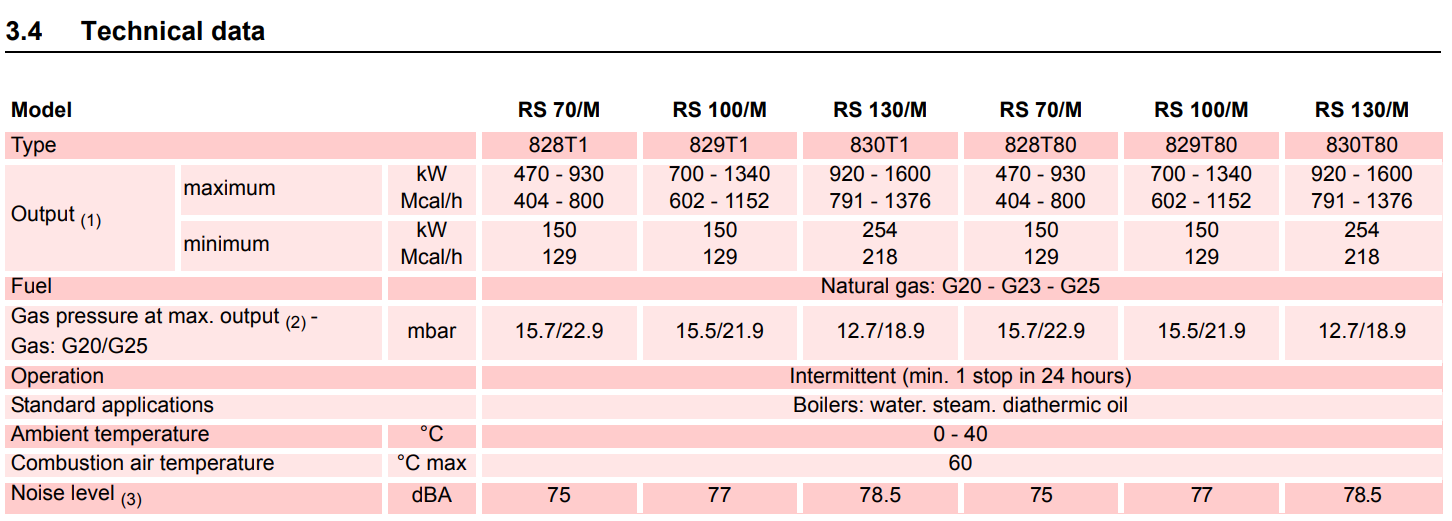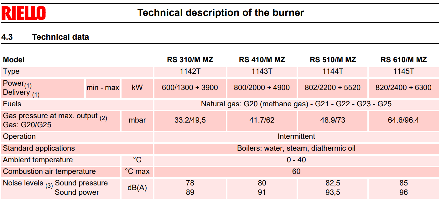 Seri pembakar RS/M mencakup rentang pembakaran dari 45 hingga 2650 kW, dan telah dirancang untuk digunakan dalam boiler air panas suhu rendah atau sedang, boiler udara panas atau uap, boiler minyak diatermik. Pengoperasiannya dapat berupa “progresif dua tahap” atau, sebagai alternatif, “modulasi” dengan pemasangan regulator logika PID dan probe terkait.