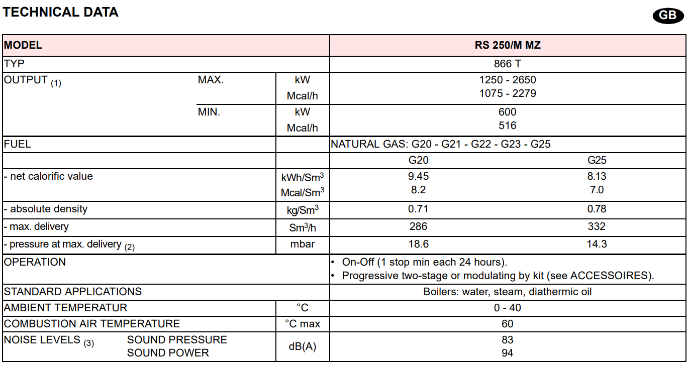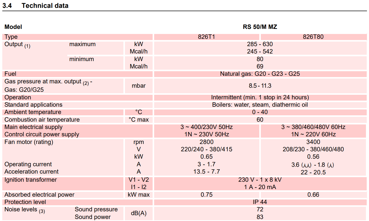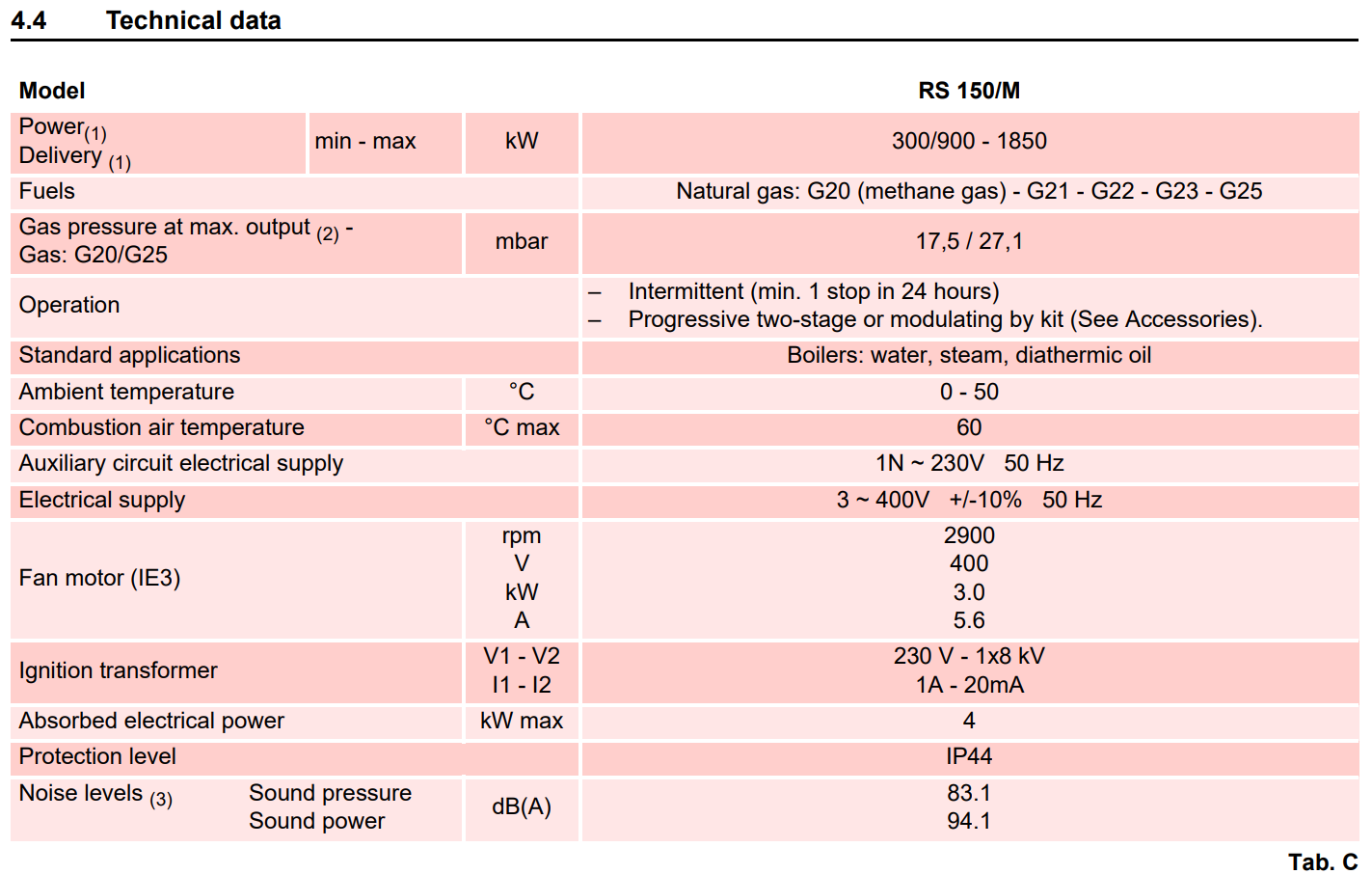 Seri pembakar RS/M mencakup rentang pembakaran dari 45 hingga 2650 kW, dan telah dirancang untuk digunakan dalam boiler air panas suhu rendah atau sedang, boiler udara panas atau uap, boiler minyak diatermik. Pengoperasiannya dapat berupa “progresif dua tahap” atau, sebagai alternatif, “modulasi” dengan pemasangan regulator logika PID dan probe terkait.