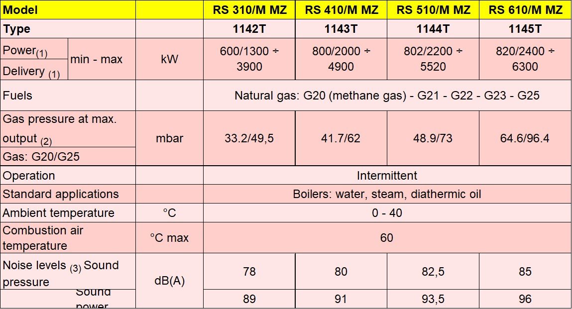 Seri pembakar RS 310-410-510-610/M MZ mencakup rentang penyalaan dari 1300 hingga 6300 kW, dan telah dirancang untuk digunakan dalam boiler air panas suhu rendah atau sedang, boiler udara panas atau uap, boiler minyak diatermik. Pengoperasiannya dapat berupa “progresif dua tahap” atau, sebagai alternatif, “modulasi” dengan pemasangan regulator logika PID atau dengan sinyal eksternal 4-20 mA/0-10 V. Perangkat cam mekanis dari regulasi memungkinkan untuk meningkatkan rasio modulasi tinggi pada semua rentang laju penyalaan.