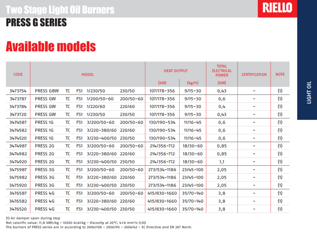 Seri pembakar PRESS G mencakup rentang pembakaran dari 107 hingga 1660 kW dan telah dirancang untuk digunakan dalam instalasi sipil dengan dimensi rata-rata, seperti area bangunan dan kelompok apartemen besar atau untuk digunakan dalam aplikasi industri, seperti pabrik kecil atau sedang.