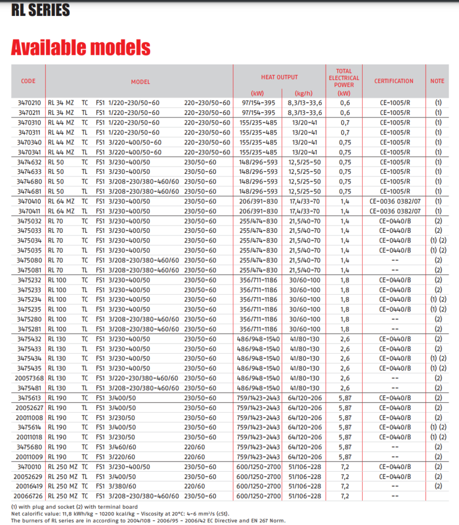 Seri pembakar RL mencakup rentang pembakaran dari 154 hingga 2700 kW, dan telah dirancang untuk digunakan dalam boiler air panas suhu rendah atau sedang, boiler udara panas atau uap, boiler minyak diatermik. Pengoperasiannya adalah “dua tahap”; pembakar dilengkapi dengan panel kontrol berbasis mikroprosesor, yang memberikan indikasi status pembakar dan penyebab kesalahan.