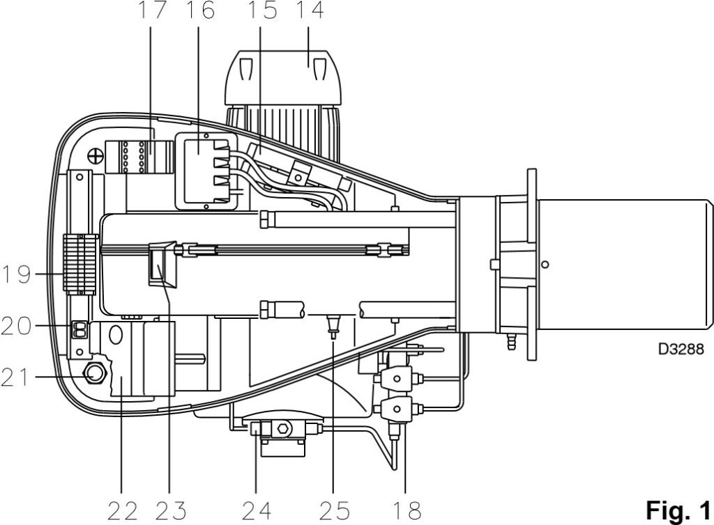 kegagalan burner dapat terjadi: Penguncian kotak kontrol: jika kotak kontrol 22)(Gbr. 1) tombol tekan (led merah) menyala, ini menandakan bahwa burner dalam keadaan terkunci. Untuk mengatur ulang, tahan tombol selama antara 1 dan 3 detik. Motor trip: lepaskan dengan menekan tombol pada pemutus termal 17)(Gbr. 1).