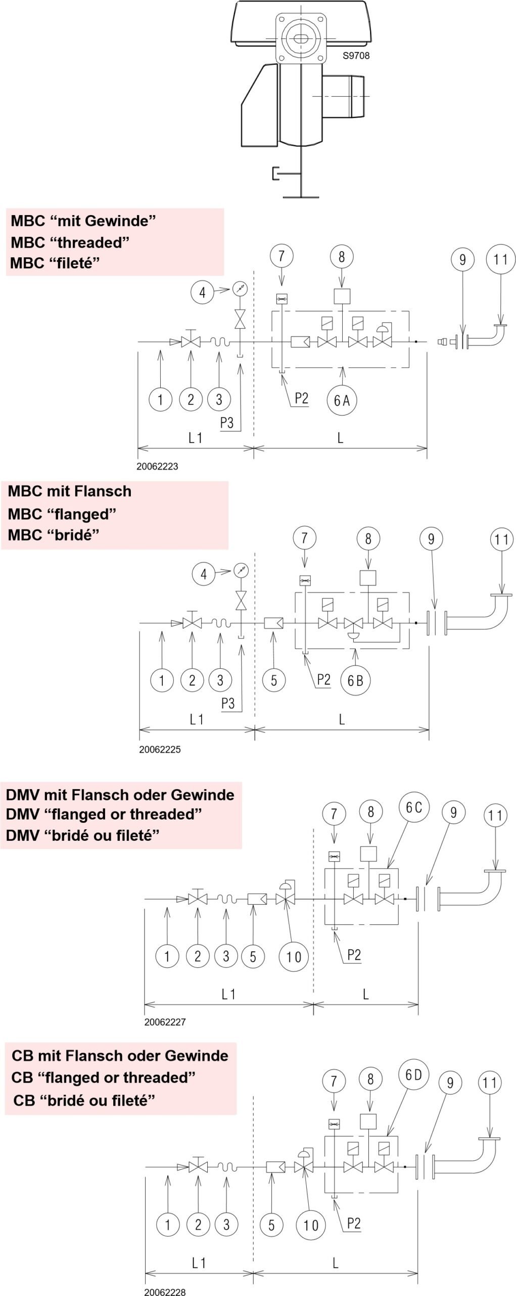 8. Kontrol deteksi kebocoran, disediakan sebagai aksesori atau terintegrasi, berdasarkan kode kereta gas. Sesuai dengan standar EN 676, kontrol deteksi kebocoran wajib untuk pembakar dengan output maksimum lebih dari 1200 kW.