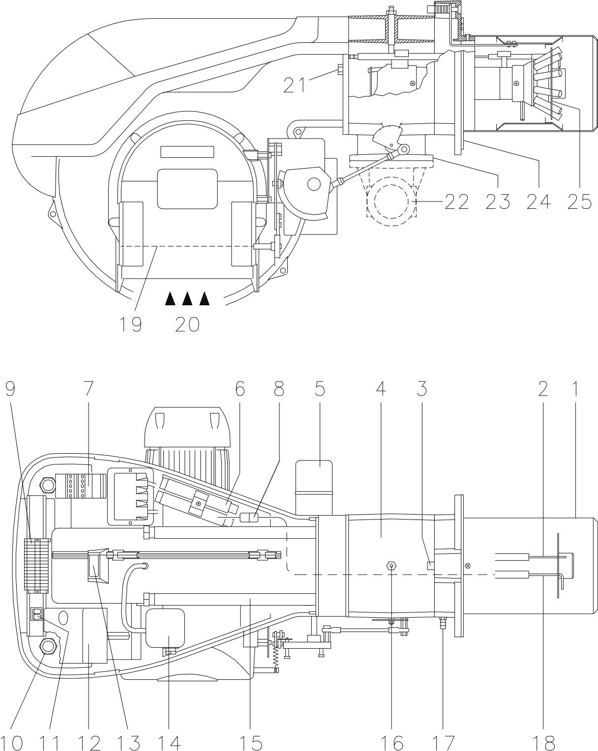 - Motor servo yang mengendalikan katup kupu-kupu gas dan katup peredam udara (dengan mekanisme cam profil variabel). Saat pembakar tidak beroperasi, peredam udara tertutup sepenuhnya untuk meminimalkan penyebaran panas dari boiler akibat aliran asap yang menarik udara dari saluran masuk kipas.