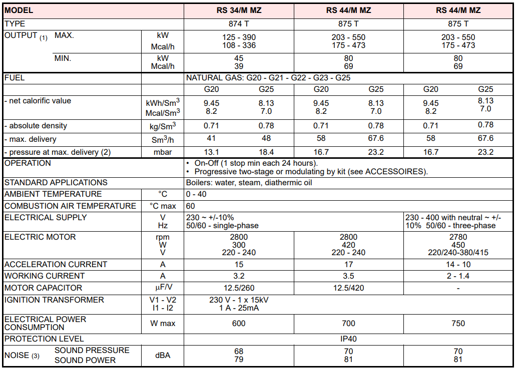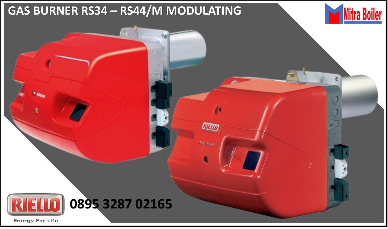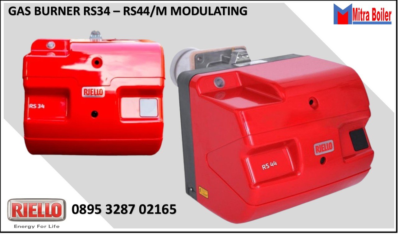 Seri pembakar RS34 -RS44/M mencakup rentang pembakaran dari 45 hingga 550 kW, dan telah dirancang untuk digunakan dalam boiler air panas suhu rendah atau sedang, boiler udara panas atau uap, boiler minyak diatermik. Pengoperasiannya dapat berupa “progresif dua tahap” atau, sebagai alternatif, “modulasi” dengan pemasangan regulator logika PID dan probe terkait.