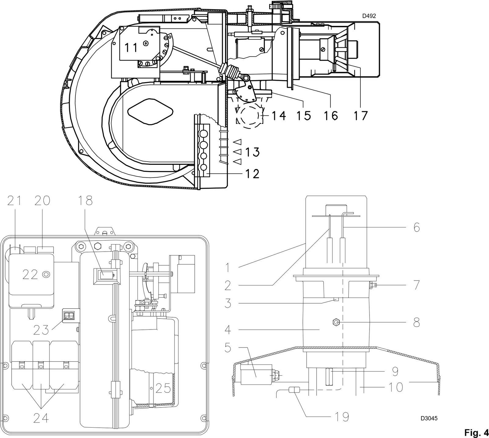 11 . Servomotor yang mengendalikan katup kupu-kupu gas dan peredam udara, melalui mekanisme cam profil variabel. Saat pembakar tidak beroperasi, peredam udara tertutup sepenuhnya untuk meminimalkan penyebaran panas dari boiler akibat aliran asap yang menarik udara dari saluran masuk hisap kipas.