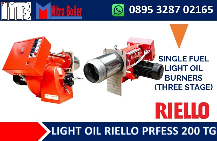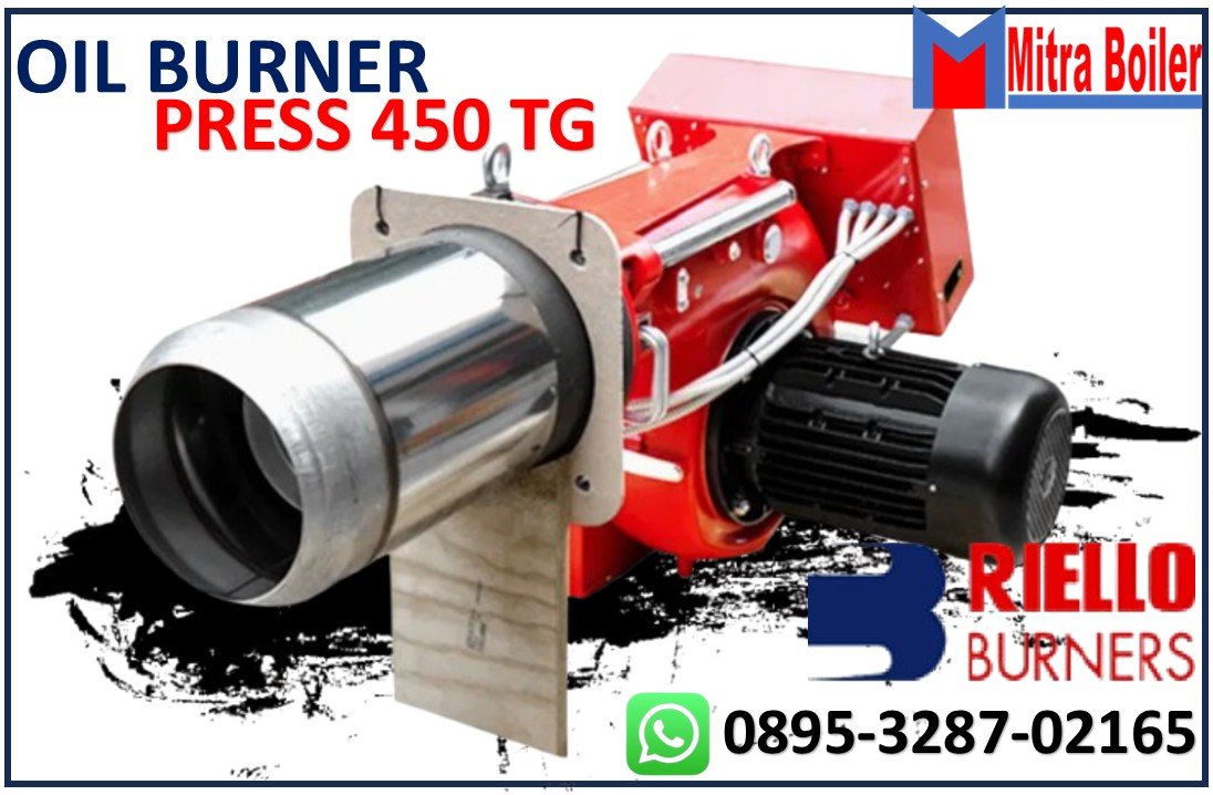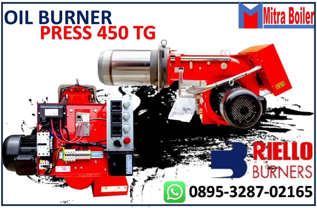 Burner Riello Press 450 T/G Adalah Pembakar Industri yang menggunakan bahan bakar Solar dengan sistem pembakaran tiga tahap dengan menggunakan tiga Nozzle. Kapasitas 765.000 Kcal hingga 4.592.000 Kcal/Jam. Seri burner PRESS T/G mencakup rentang daya pembakaran dari 830 hingga 5340 kW. Tersedia dalam 4 model berbeda, burner ini sangat cocok untuk dipasangkan dengan boiler ruang bertekanan.