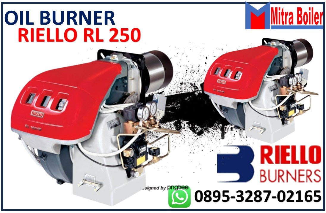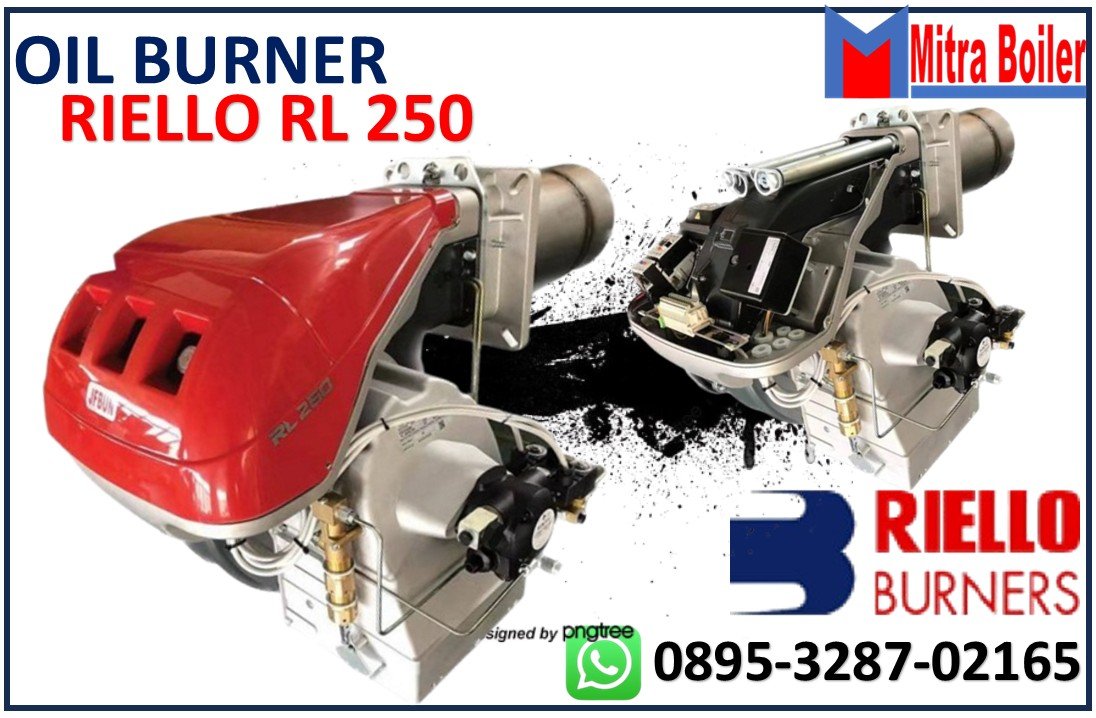 Burner Riello RL 250 Adalah mesin Pembakar Industri dengan bahan bakar Solar Brand Riello Italia. kapasitas mencakup rentang daya pembakaran dari 1.075.000 hingga 2.322.000 Kcal/jam, dan telah dirancang untuk digunakan pada boiler air panas suhu rendah atau menengah, boiler udara panas atau uap, serta boiler minyak diatermik.