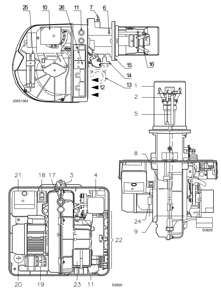 10 Motor servo yang mengendalikan katup kupu-kupu gas dan peredam udara (melalui mekanisme cam profil variabel). Saat pembakar dimatikan, peredam udara akan tertutup sepenuhnya untuk mengurangi kehilangan panas akibat aliran udara cerobong asap, yang cenderung menarik udara dari saluran masuk udara kipas. 11 Area untuk jalur kabel listrik